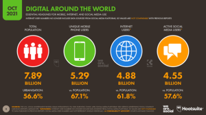 Between 2019 and 2021, global social media users grew by 11%, from 3.4 billion to 3.8 billion. In the 12 months before October 2021, the volume of users grew by 400 million (almost 10%), and while that trend is slowing, it remains at nearly 1 million new users per day.